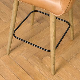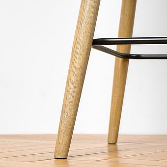 Ножки стула изготовлены из тёмной древесины, контрастирующей с металлической фурнитурой. Подножка обеспечивает надежную поддержку и добавляет элегантности дизайну стула.