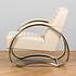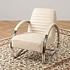 Обивка из натуральной кожи тёплого белого оттенка дарит ощущение уюта и утончённости, а плавные хромированные подлокотники, переходящие в изогнутые ножки-полозья, отсылают к эстетике ретро-дизайна. Кресло выглядит как арт-объект, но при этом абсолютно удобно и функционально.