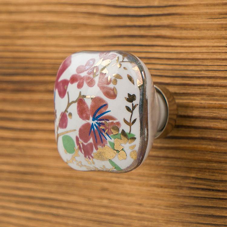 Роскошная керамическая ручка с золотым цветочным узором в виде петуний придаст нотку элегантности кухонным шкафчикам, комодам и выдвижным ящикам.